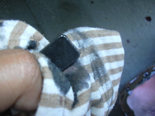 これがATFのオイルパンにくっついている磁石の清掃時の写真です。小さい磁石ですが、いい仕事をしています。ウエスが真っ