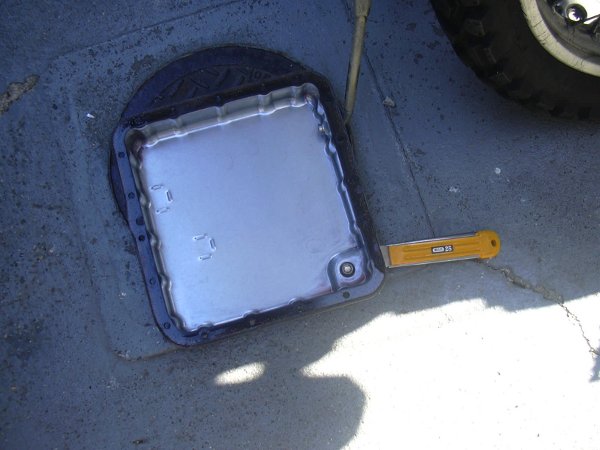 ATFのオイルパンの残った油を大まかに取り除いた状態です。写真真ん中にあるものは磁石です。ATF内部の金属粉を磁石に