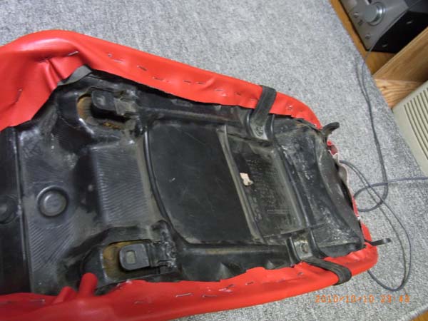 シートの後ろのほうのタッカーの部分ですね。まだ、こちらのほうがましですね。普通の椅子のシートと同じように貼れますね。やっぱり前のシートのほうが曲がりがきついため、なかなか大変でした。